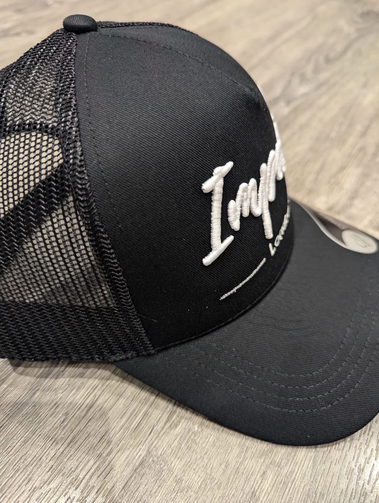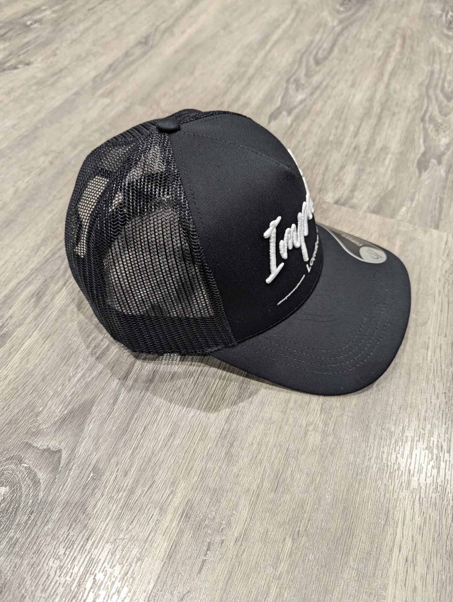The cap features a striking white 3D embroidered logo, adding a crisp and dynamic contrast to the sleek black design. A must-have accessory, it pairs effortlessly with any outfit, perfect for casual outings or making a statement on the go.