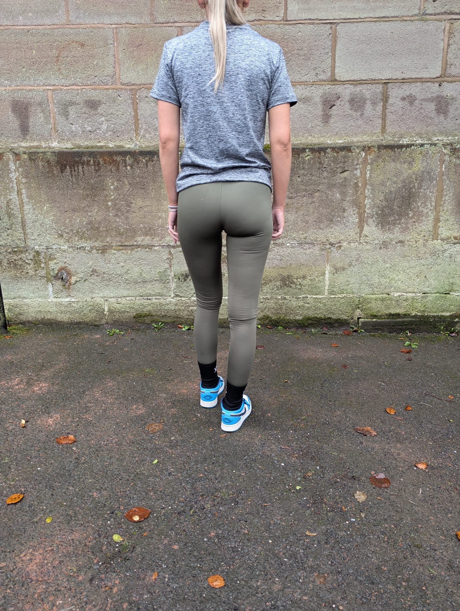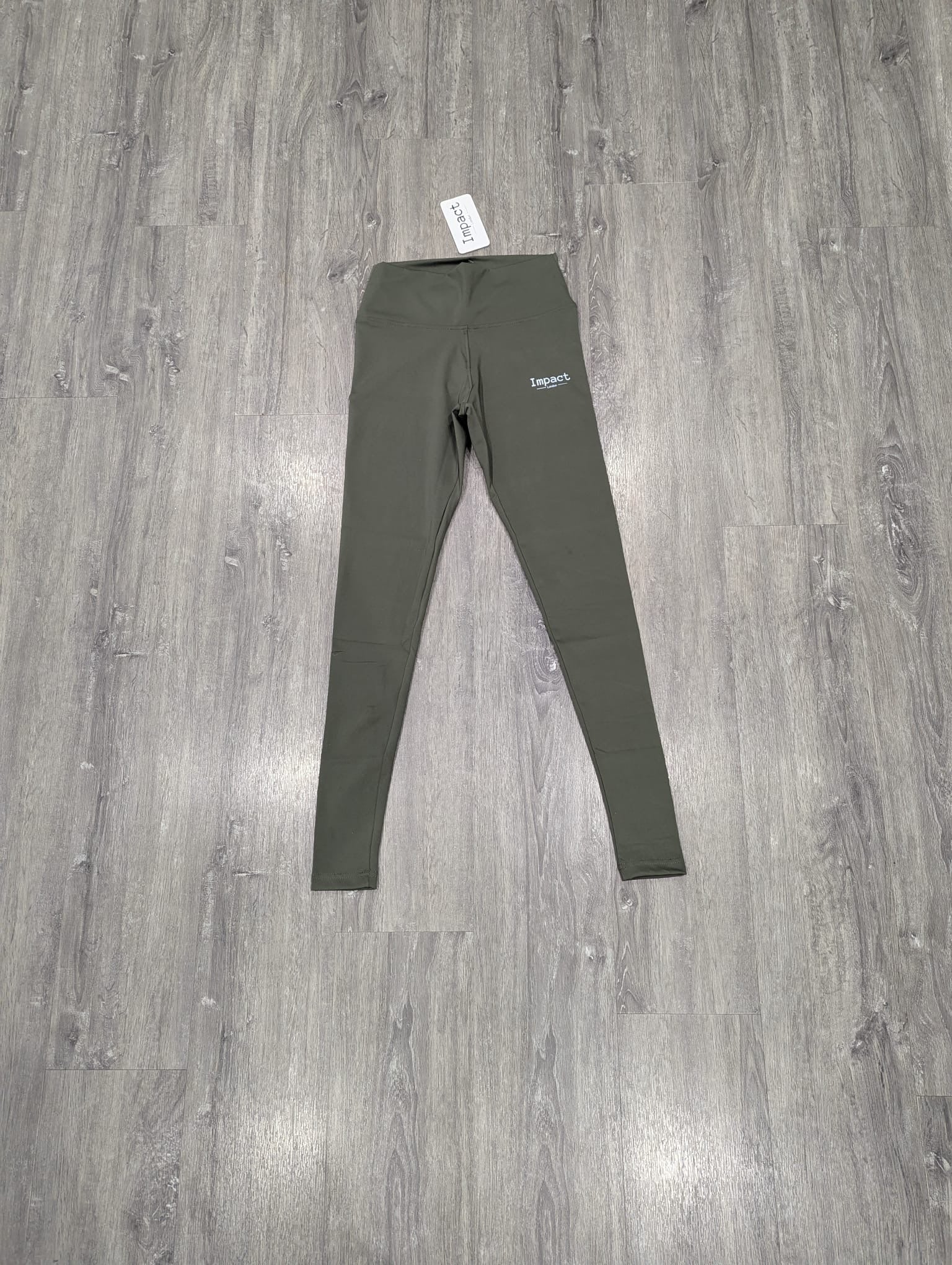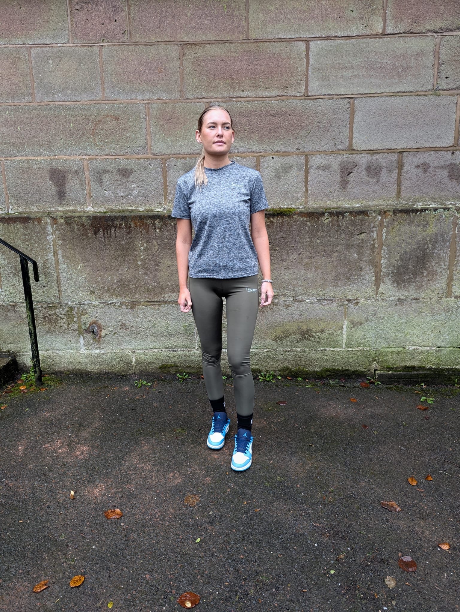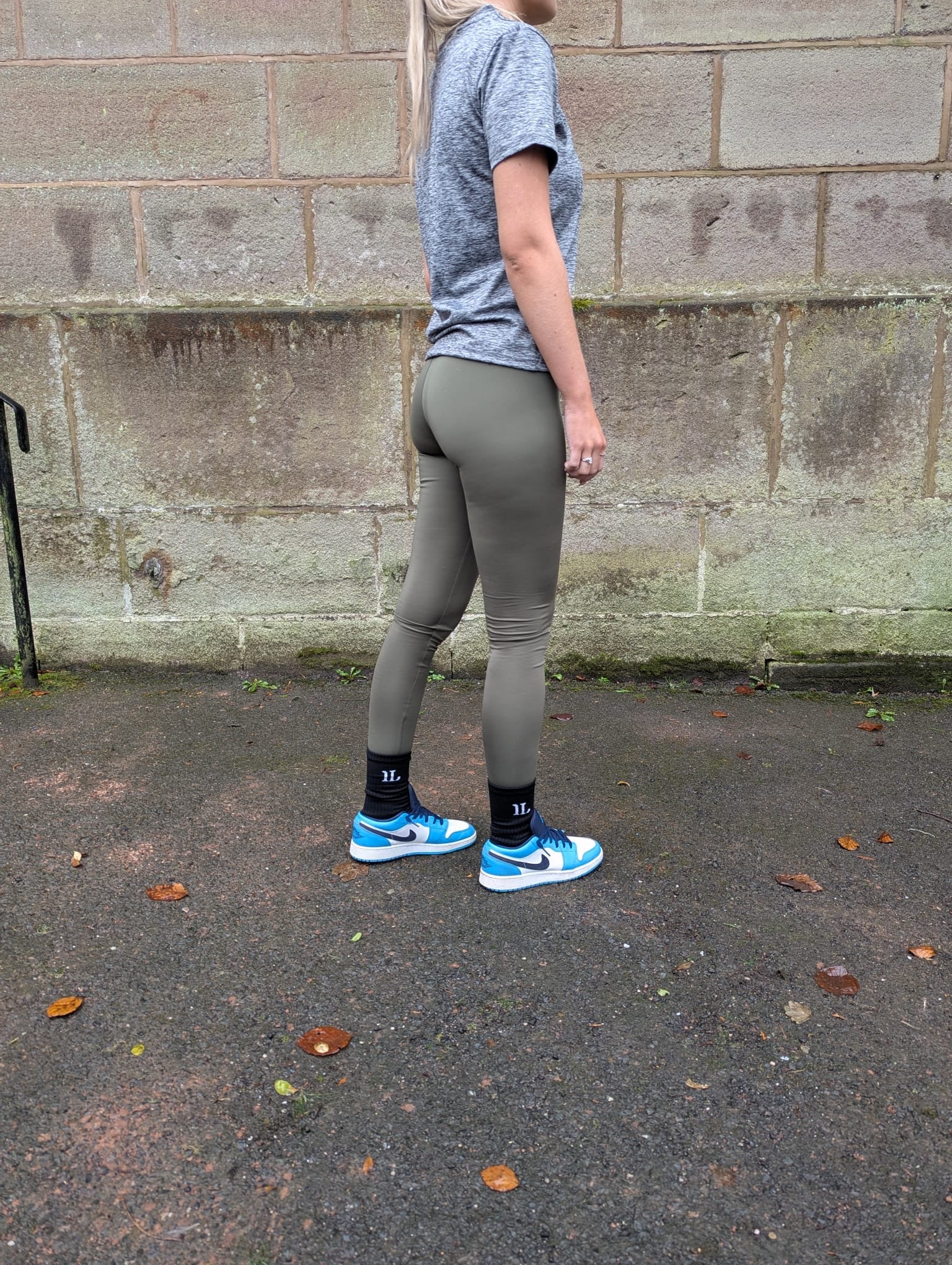 The perfect casual item of clothing that you can wear all year round are our classic olive green high waisted leggings with white printed logo for women.