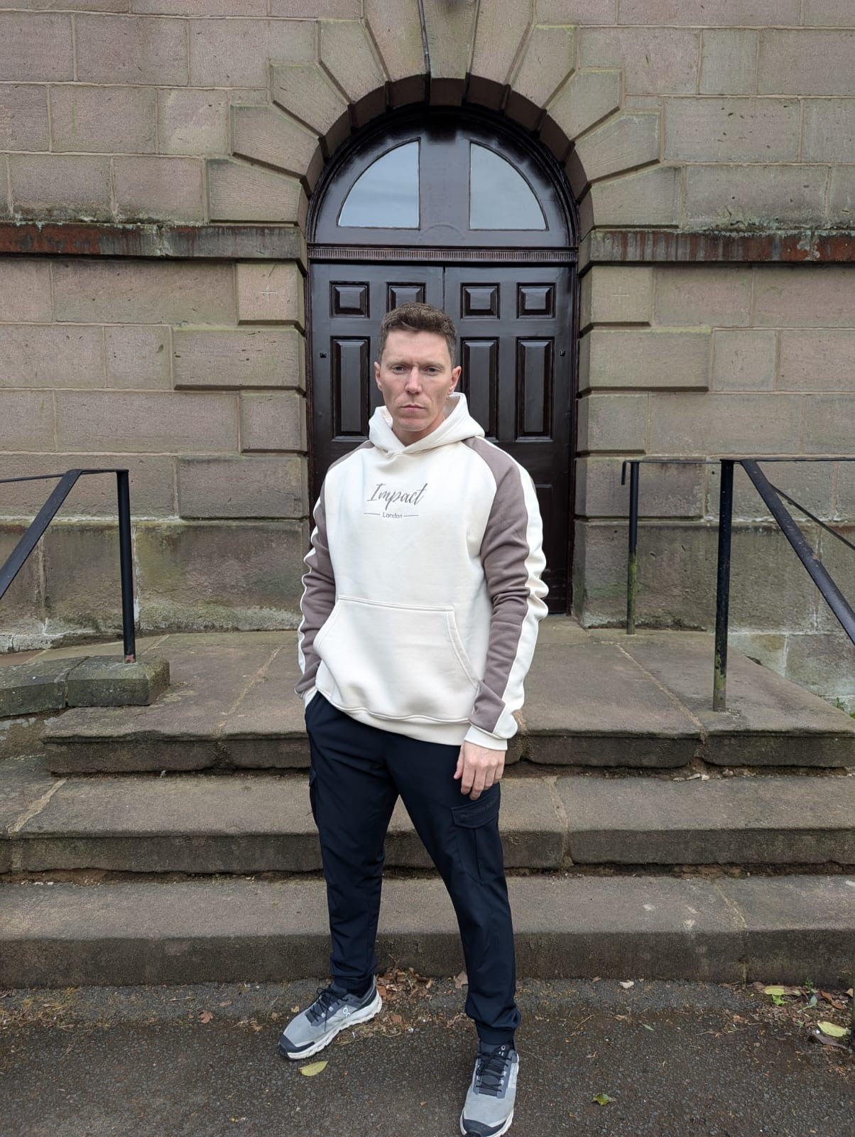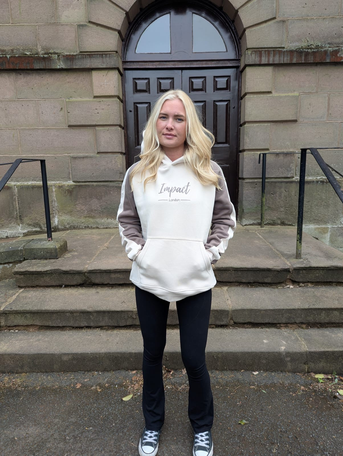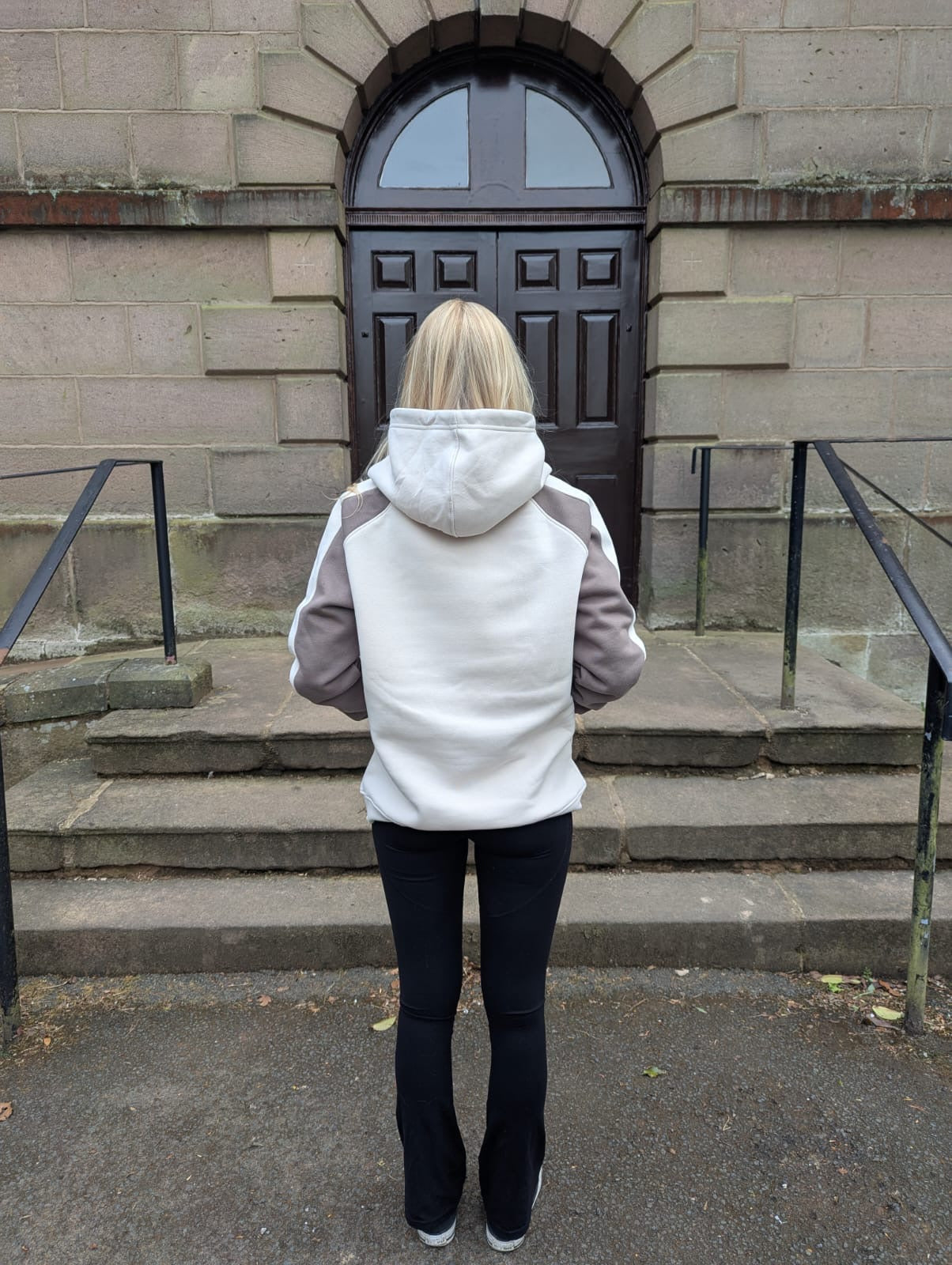 Oversized Off White Hoodie with Brown Sleeves and Brown Embroidered Logo